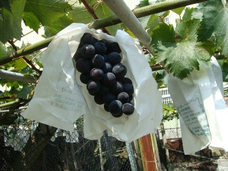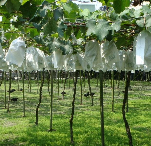 我們採用一年只生產一次(每年約6月~7月採收)。葡萄樹經歷半年調養與休息;約在1月左右開始整理、剪枝準備發芽,長出新的葉子,開花與結果;完成時,就能看到小小的葡萄形成。當可以分辨出果粒時,即要進行三次以上葡萄疏果、篩選與淘汰,只保留部份葡萄(約只保留無套袋的1/3產量);再用防水、防蟲害、防農藥汙染而透氣的紙袋.把每串葡萄各別包起來,隔離不被污染,因此需要更長的生長時間,讓每串套袋葡萄都能得到較好的生長環境,即可產生較結實、帶Q、色澤均勻、甜度較佳的果實。這也就為什麼,套袋葡萄產量少,市面上較少見,高貴優質套袋葡萄,售價親民,數量有限,敬請把握機會。