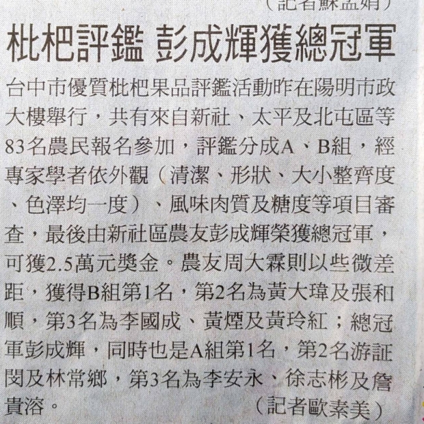 台中市政府農業局為提升枇杷栽培技術及果品品質,讓消費者能安心選購優質產品,28日特舉辦「107年台中市優質枇杷果品評鑑活動」,共有83位農民參加,分A、B組進行評鑑,由農友彭成輝勇奪總冠軍殊榮;藉此加強重質勝於重量的生產觀念,推廣在地優質枇杷及打開知名度。